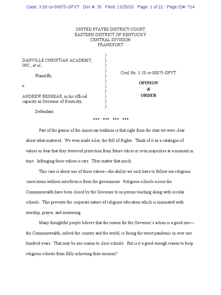Judge Van Tatenhove Order Dca Vs Beshear Pdf Establishment Clause Cantwell V Connecticut